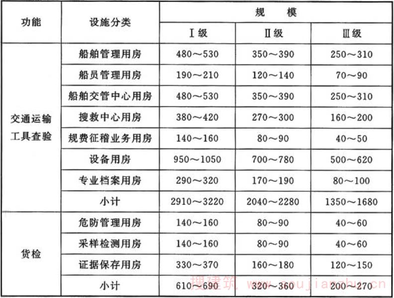 海事各类业务技术设施如条文中各表所示,表中罗列的设施为还是相关规范中要求设置的设施,各口岸根据实际情况,可调整各业务技术用房功能,在总面积控制前提下调剂各类用房面积。