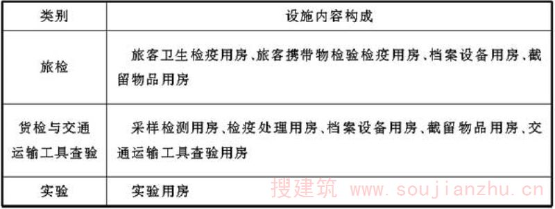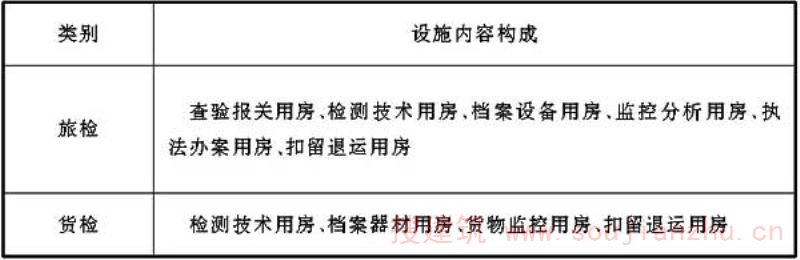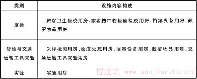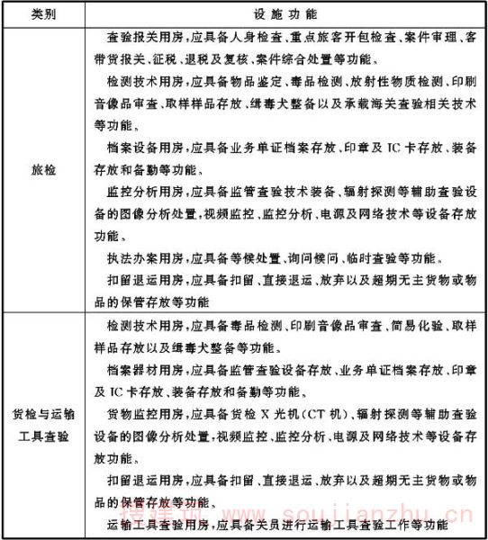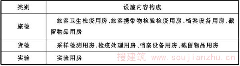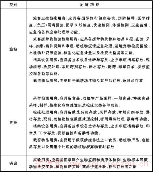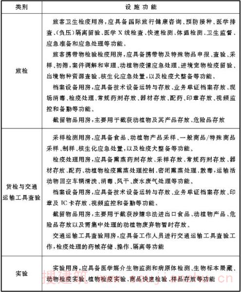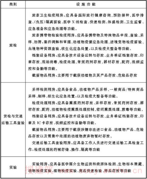检验检疫各类业务技术设施如条文中各表所示,表中罗列的设施为检验检疫相关规范中要求设置的设施,各口岸根据实际情况,可调整各业务技术用房功能,在总面积控制前提下调剂各类用房面积。