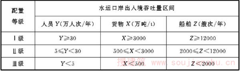 按照口岸设计的最高年出入境人员、货物、船舶等主要业务吞吐量指标,将口岸作业区分别划分为三个等级,当某个指标到达相应的区间,则将该口岸定为该指标的对应级别。例如,某口岸年货物吞吐量4000万t,人员吞吐量3万人次,船舶3000艘次,则将其定为货运Ⅰ级,客运Ⅲ级,船舶Ⅱ级。