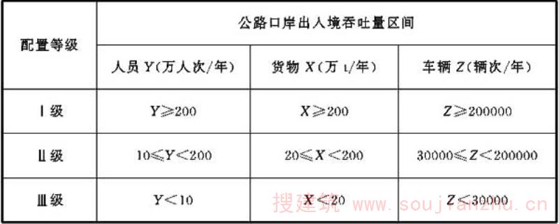 合理划分等级的目的在于有效区分查验设施建设规模指标的层次,是保证指标具有广泛适应性和科学指导性的前提和基础。根据公路口岸运行特点,将相应的场站吞吐量作为关键参数。由于公路口岸查验基础设施为所属公路场站的功能分区,其出入境人员、货物、交通运输工具年预测量应以所属公路场站的相关预测量为参考。