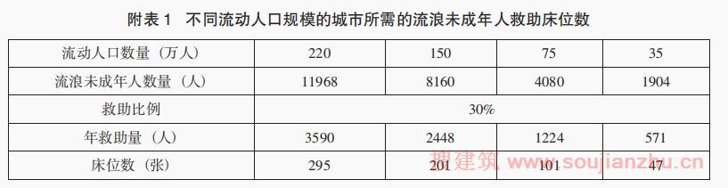 五、根据上面的方法和说明,附表1给出了辖区内流动人口规模分别为220万、150万、75万、35万的城市,其流浪未成年人救助保护中心所应建设的规模(床位数)。