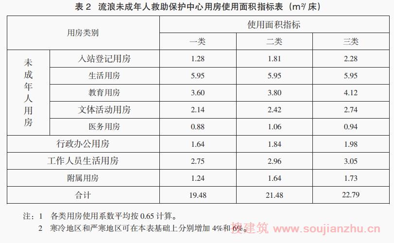 第十九条流浪未成年人救助保护中心各类用房使用面积指标参照表2确定。