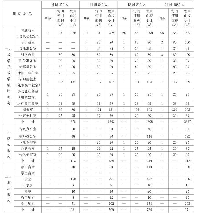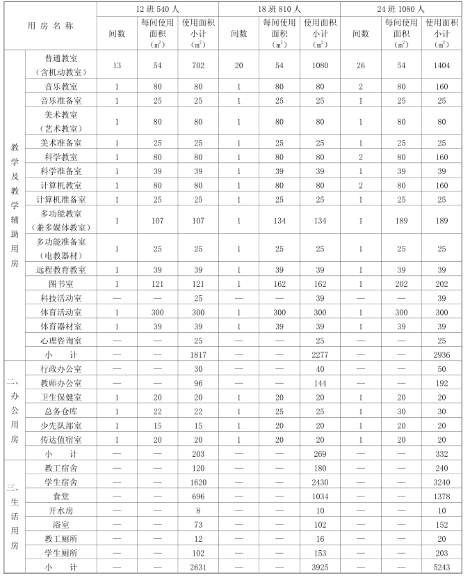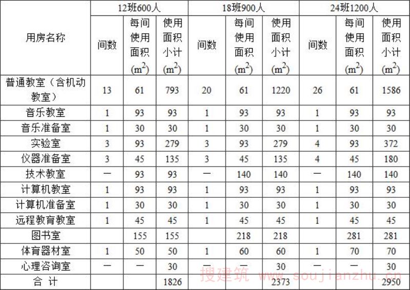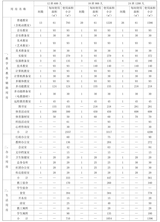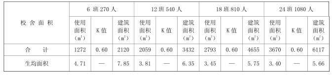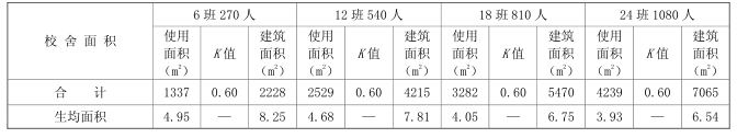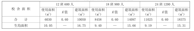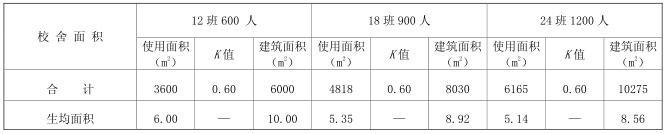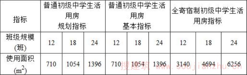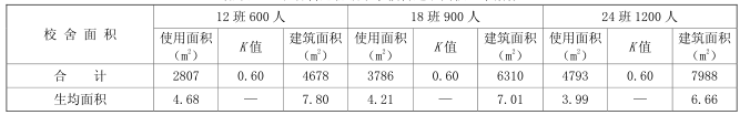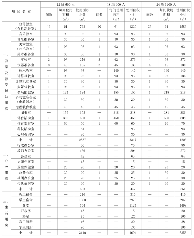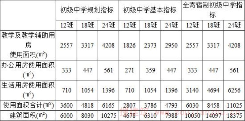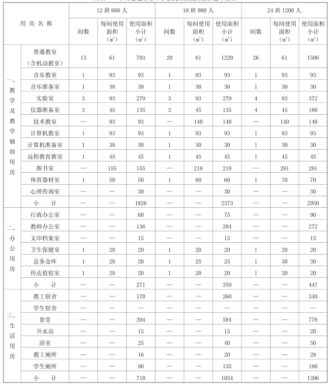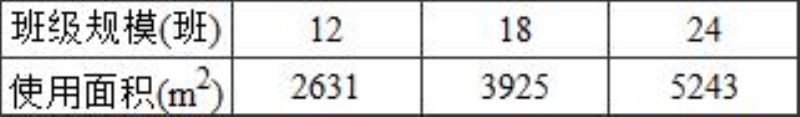 注:以上12班、18班、24班普通初级中学的使用面积未包括学生宿舍的使用面积。