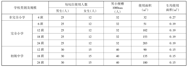 四 、 厕 所 。 小 学 生 和 初 级 中 学 生 的 年 龄 都 较 小 , 而 且 课 间 上 厕 所 的 时 间 短 、 人 流 集 中 ; 再 加 上 生 活 习俗 等 因 素 , 学 校 设 置 单 独 厕 所 的 居 多 , 学 生 上 厕 所 的 距 离 增 大 , 因 此 标 准 中 相 应 减 少 了 每 个 坑 位 的 使 用人 数 , 适 当 放 宽 了 每 个 坑 位 的 使 用 面 积 。 从 有 利 于 学 校 环 境 和 卫 生 出 发 , 有 上 下 水 的 地 区 仍 以 设 置 楼 内厕 所 为 宜 , 厕 所 坑 位 可 适 当 减 少 。 学 生 厕 所 使 用 面 积 应 符 合 表 附 表 5 的 规 定 。 附 表 5 学 生 厕 所 使 用 面 积