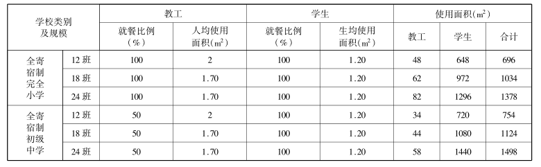 厨 房 包 括 初 加 工 、 烹 饪 、 备 餐 间 、 仓 库 等 。 厨 房 加 工 操 作 间 最 小 使 用 面 积 不 得 少 于 8m2 。 全 寄 宿 制 完 全 小 学 、 全 寄 宿 制 初 级 中 学 食 堂 按 学 生 人 数 的 100%计 , 使 用 面 积 应 符 合 附 表 4 的 规 定 。 附 表 4 全 寄 宿 制 中 小 学 校 食 堂 使 用 面 积