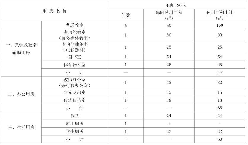 一、小学:非完全小学设置普通教室、多功能教室(兼多媒体教室)、图书室、体育器材室;完全小学设置普通教室、音乐教室、美术教室(艺术教室)、科学教室、计算机教室、多功能教室(兼多媒体教室)、远程教育教室、图书室、科技活动室、体育活动室、心理咨询室。以及教学辅助用房。