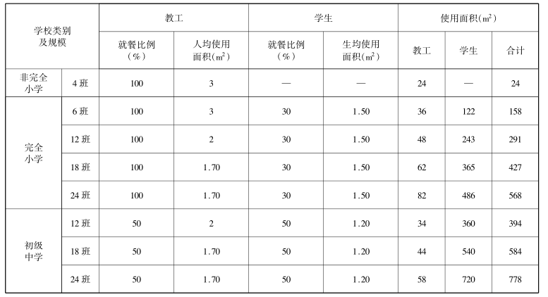 第 二 十 八 、 二 十 九 条 农 村 普 通 中 小 学 校 的 生 活 用 房 : 一 、 教 工 宿 舍 。 非 完 全 小 学 的 教 师 很 少 , 为 本 村 或 邻 村 人 , 一 般 不 设 置 单 身 宿 舍 。 完 全 小 学 、 初 级 中学 分 别 按 教 职 工 编 制 的 30%、 50%配 置 , 全 寄 宿 制 完 全 小 学 、 初 级 中 学 分 别 按 教 职 工 编 制 的 50%、 60%配 置 , 使 用 面 积 均 为 10m2 /人 。 规 模 小 的 完 全 小 学 和 初 级 中 学 , 教 工 单 身 宿 舍 可 与 行 政 、 教 师 办 公 用 房统 一 规 划 建 设 。 引 进 外 地 教 师 较 多 的 学 校 , 为 有 利 于 稳 定 教 师 队 伍 , 帮 助 教 师 解 决 住 宿 困 难 , 在 上 级 部门 和 乡 ( 镇 ) 政 府 支 持 下 , 在 学 校 周 边 设 立 或 建 设 教 师 住 宿 周 转 房 , 供 外 地 教 师 在 未 购 住 宅 前 住 宿 。 二 、 学 生 宿 舍 。 为 适 应 教 育 发 展 和 教 育 改 革 的 需 要 , 各 地 都 在 合 理 规 划 调 整 农 村 普 通 中 小 学 校 的 布局 , 形 成 “ 规 模 ” 办 学 , 以 提 高 办 学 效 益 和 教 育 质 量 。 因 此 , 完 全 小 学 ( 主 要 是 高 年 级 ) 和 初 级 中 学 都 应 根据 上 述 要 求 、 学 校 服 务 半 径 的 增 大 等 因 素 , 设 置 一 定 比 例 的 学 生 宿 舍 。 学 生 宿 舍 用 房 包 括 居 室 、 盥 洗 、 厕所 和 值 班 人 员 等 各 种 用 房 。 一 般 学 校 学 生 宿 舍 的 总 建 筑 面 积 和 用 地 面 积 , 应 根 据 实 际 情 况 确 定 住 宿 生人 数 ( 比 例 ) , 完 全 小 学 按 使 用 面 积 3m2 /生 , 初 级 中 学 按 使 用 面 积 330m2 /生 配 置 , 提 出 需 建 设 的 学 生 宿舍 总 建 筑 面 积 和 用 地 面 积 , 在 立 项 时 一 并 上 报 。 三 、 食 堂 。 非 完 全 小 学 、 完 全 小 学 的 教 职 工 编 制 都 较 少 , 故 教 职 工 的 就 餐 比 例 宜 按 教 职 工 人 数100%计 ; 初 级 中 学 的 教 职 工 编 制 稍 多 些 , 且 部 分 教 职 工 住 在 学 校 附 近 , 故 教 职 工 的 就 餐 比 例 按 教 职 工 人数 50%计 。 食 堂 的 面 积 还 应 考 虑 部 分 学 生 的 用 餐 或 蒸 饭 的 需 要 , 以 及 小 学 低 年 级 课 间 供 应 点 心 。 食 堂 使 用 面积 应 符 合 附 表 3 的 规 定 。 附 表 3 普 通 中 小 学 校 食 堂 使 用 面 积