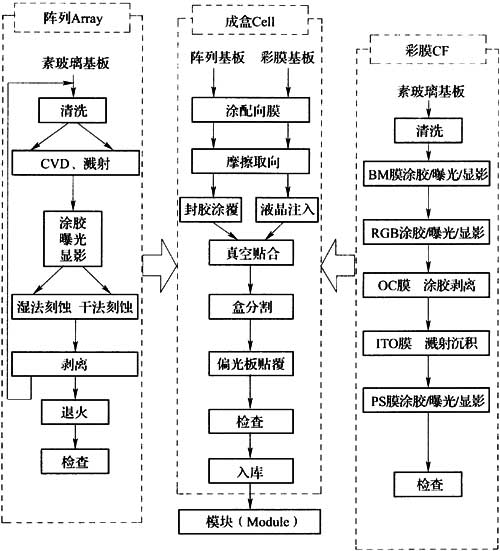 将已制备好的薄膜晶体管液晶显示器阵列玻璃基板和彩色滤光片玻璃基板组装到一起,使两块玻璃基板之间充有液晶材料,加上适应的电场即可进行图像显示的液晶盒(屏)的工艺过程。