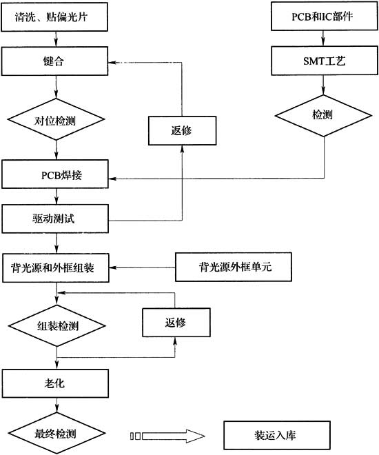 A.0.2 薄膜晶体管液晶显示器模组工序(图A.0.2)应包括清洗、贴偏光片,键合,背光源组装,测试,老化各工序。
