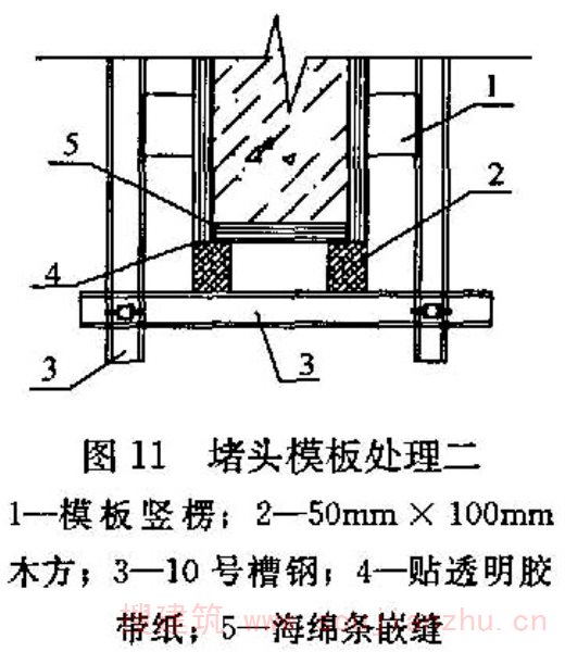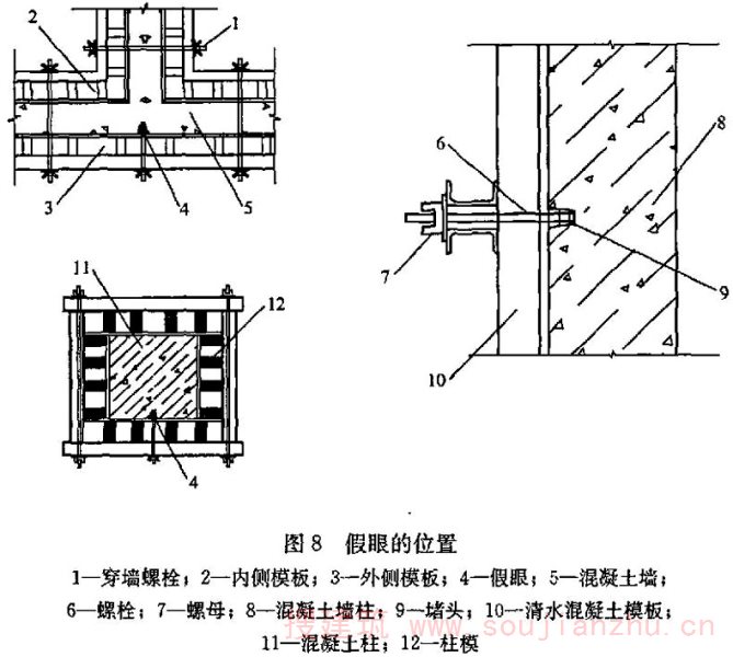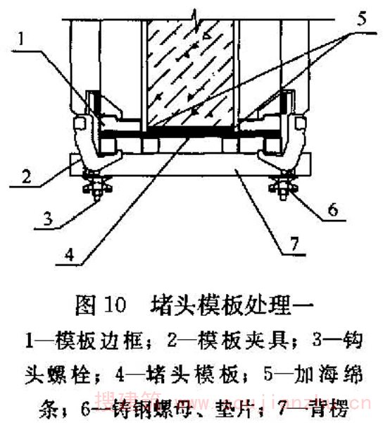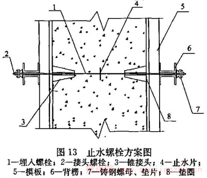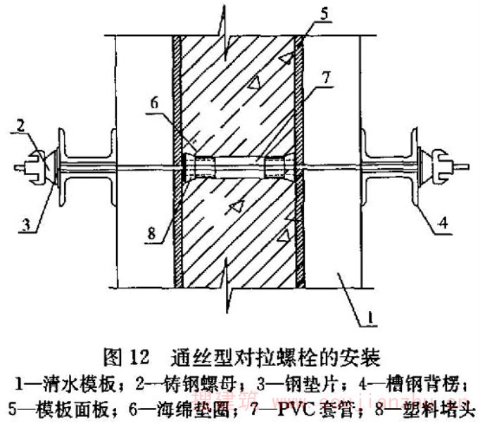 5 螺栓孔的封堵:采用三节式螺栓时,中间一节螺栓留在混凝土内,两端的锥形接头拆除后用补偿收缩防水水泥砂浆封堵,并用专用封孔模具修饰,使修补的孔眼直径、孔眼深度与其他孔眼一致,并喷水养护。采用通丝型对拉螺栓时,螺栓孔用补偿收缩水泥砂浆和专用模具封堵,取出堵头后,喷水养护。