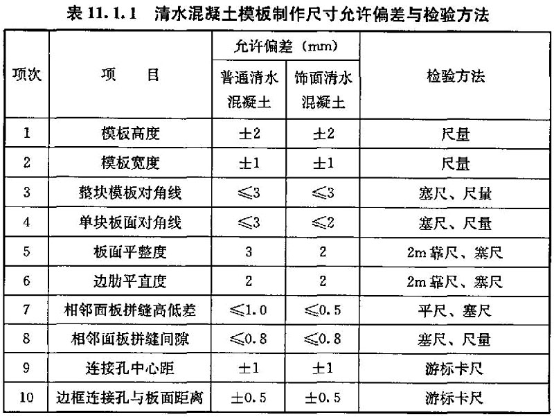 11.1.1 模板制作尺寸的允许偏差与检验方法应符合表11.1.1的规定。