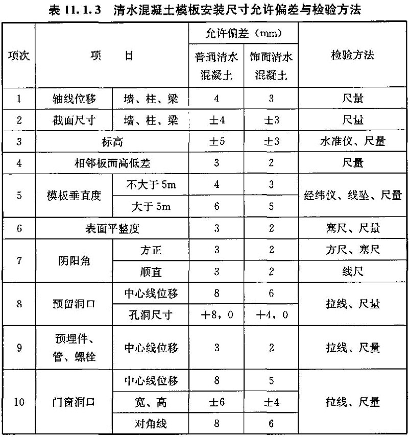 11.3.2 清水混凝土结构允许偏差与检查方法应符合表11.3.2的规定。