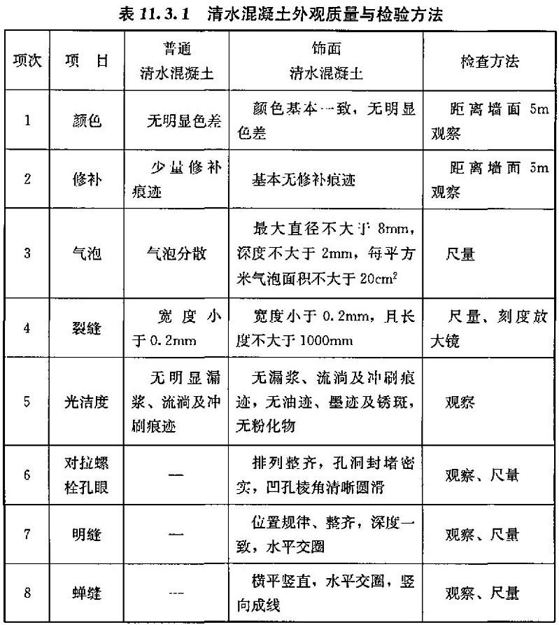 11.3.1 混凝土外观质量与检验方法应符合表11.3.1的规定。