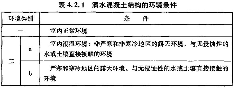 4.2.1 本条规定了设计清水混凝土范围。规定了设计使用年限为50年的三类环境类别的清水混凝土结构的建筑要结合当地环境进行专门研究。