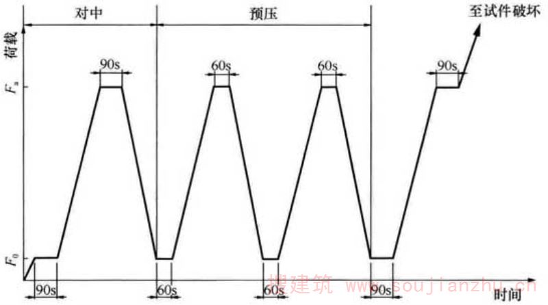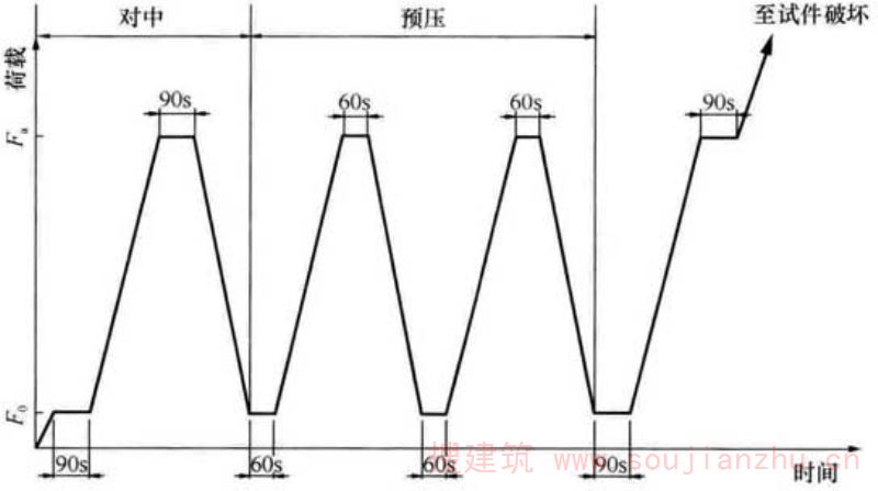 9 在确认试件对中符合本条第8款规定后,以与加荷速度相同的速度卸荷至基准应力0.5MPa(F 0 ),恒载60s;然后用同样的加荷和卸荷速度以及60s的保持恒载(F 0 及F a )至少进行两次反复预压。在最后一次预压完成后,在基准应力0.5MPa(F 0 )持荷60s并在以后的30s内记录每一测点的变形读数ε 0 ;再用同样的加荷速度加荷至F a ,持荷60s并在以后的30s内记录每一测点的变形读数ε a ,如图7.0.4所示。