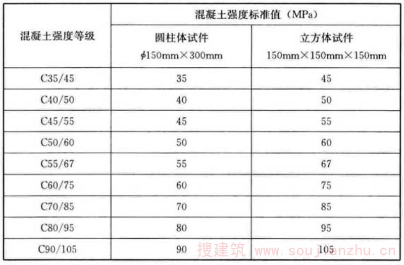 C.0.4本条规定了圆柱体试件试验结果计算和确定方法。 对于高强混凝土,国外的有关试验表明,试件抗压强度为72MPa~126MPa,在采用ф100mm×200mm非标准试件时,其尺寸换算系数为0.95。而ASTM建议高强混凝土ф100mm×200mm非标准试件的尺寸换算系数为0.96。本标准规定ф100mm×200mm非标准试件的尺寸换算系数一律为0.95。 根据《Designofconcretestructures》(EN1992-1-1:2004),圆柱体和立方体试件按抗压强度划分的抗压强度等级对应关系列于表4。 表4欧盟标准中圆柱体和立方体试件按抗压强度划分的抗压强度等级对应关系