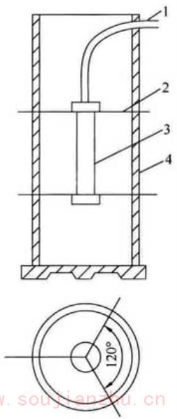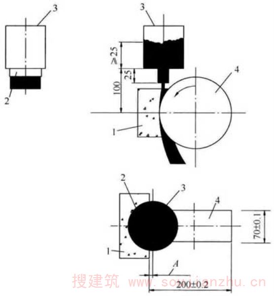 4 将圆柱体试件置于试验机中心,在上、下压板与试件承压线之间各垫一条垫条,圆柱体轴线应在上、下垫条之间保持水平,垫条的位置应上下对准(图E.0.3-1)。宜把垫层安放在定位架上使用(图E.0.3-2)。