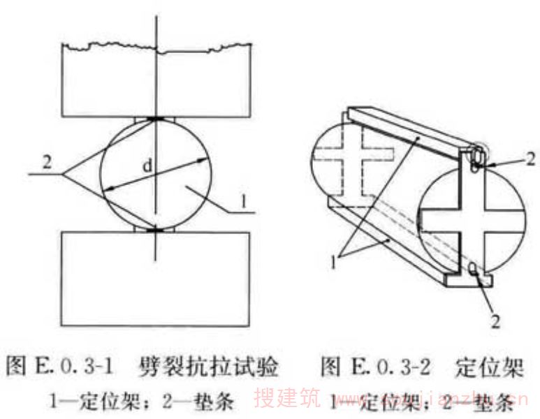 E.0.3本条规定了劈裂抗拉强度试验的试验步骤。 1试件从养护地取出后应尽快进行试验,在条件许可时,宜采用湿毛巾等覆盖试件,以避免试件的内部湿度发生变化。 4由于劈裂抗拉强度试验的对中较困难,而且由于对中误差,也会导致较大的试验误差。试验步骤中规定了为保证对中精度和提高试验效率,可把垫条和试件安装在定位架上使用,并给出了定位架示意图。 5修订了加载速率,与修订后的立方体试件劈裂抗拉强度试验的加荷速度保持一致。
