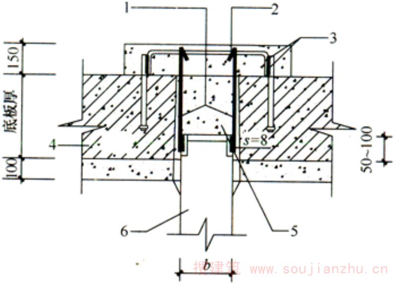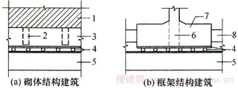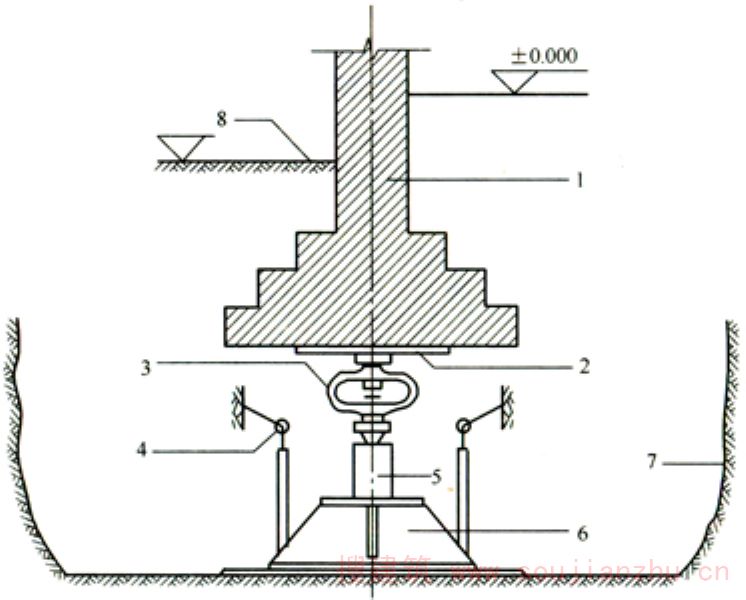 1—建筑物基础;2—钢板;3—测力计;4—百分表;5—千斤顶;6—试验压板;7—试坑壁;8—室外地坪