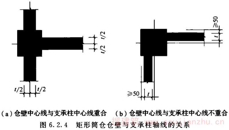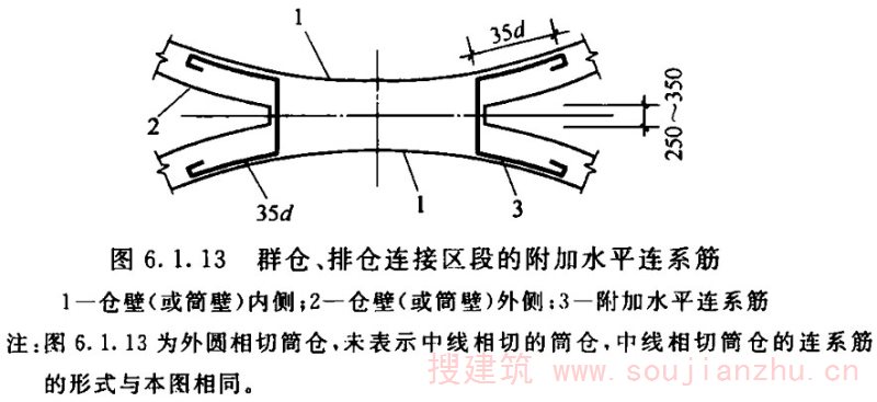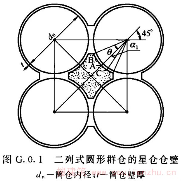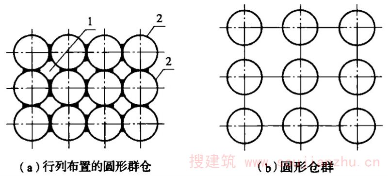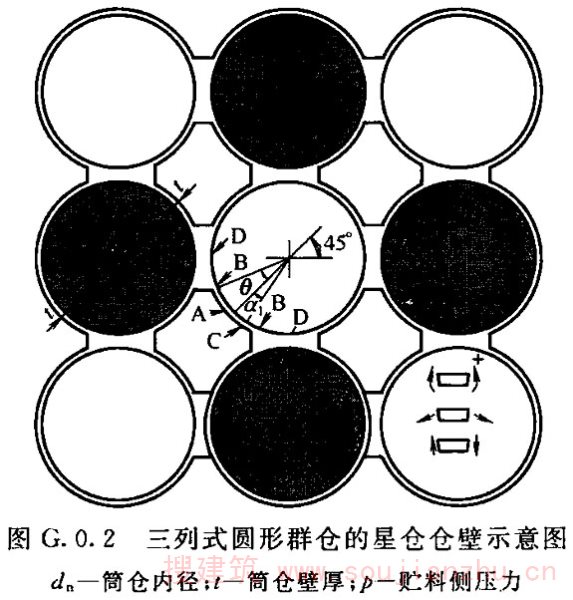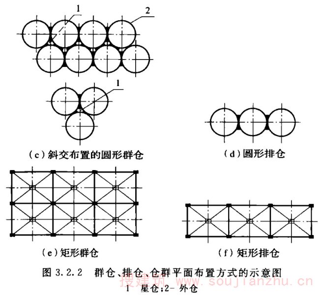 2.1.14 为区别于排仓,群仓应多于三个且不排在一条直线上。本标准中的群仓相互间的连接方式均认定为仓壁相连,不包括釆用壁板连接的群仓;其仓间形成的空间仓体称为星仓;连体筒仓有外壁相切、仓壁中线相切的连接方式,前者计算及施工简单,连接部位为构造配筋,可按单仓计算。后者计算、施工都很复杂,不宜釆用。