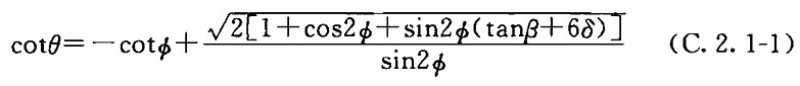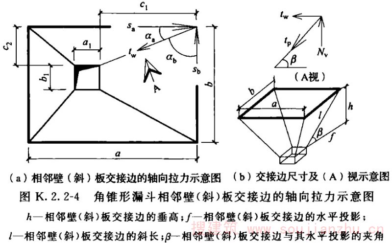 4 顶部无仓壁的对称、非对称角锥形漏斗,在自重、贮料及其他附加荷载作用下,相邻壁(斜)板交接边棱的轴向拉力t p (图K.2.2-4)应按下列公式计算: