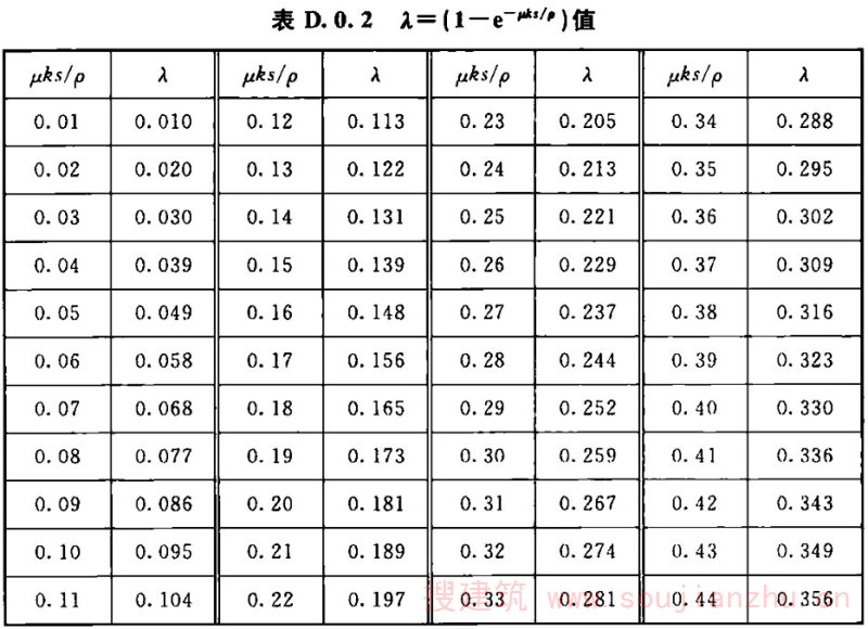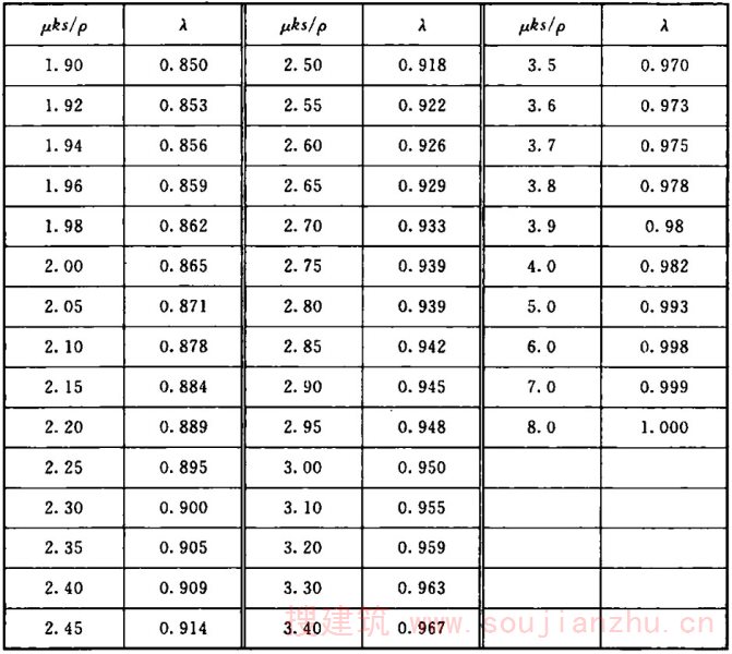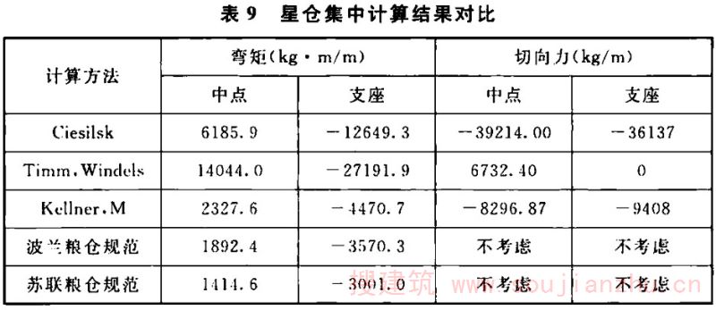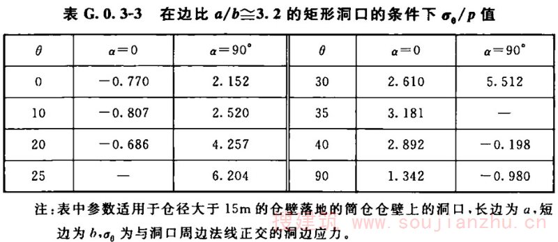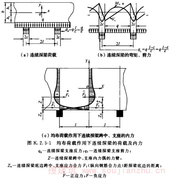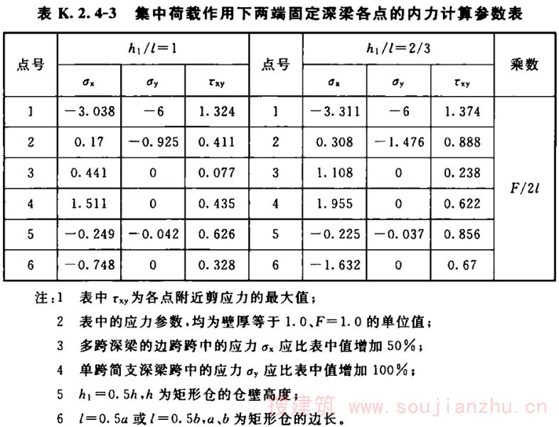 (6)K.2.4-1~K.2.4-3的连续深梁的计算图表,是按弹性理论将深梁以普通浅梁的计算形 式表述的,但并不是浅梁的计算结果。当设计矩形浅仓及深仓时,利用这些表格可非常有效地提高设计效率。在K.2.4-3的表格中,给出了连续深梁跨中及支座的内应力图,并给出了内应力图面积的合力F的值及其位置。设计 者可利用该值,釆用集中配筋的方式配置钢筋;深梁的应力分析是很复杂的问题,与其深梁的高跨比、支承条件、外力作用的特性和作用的位置及结构材料的特性有关。深梁按弹性理论分析时,可求得梁内各单元体的σ y 、σ x 、τ xy 及其主应力,并以此配置钢筋。当单元体的划分非常细密时,钢筋必须分区段而不是按每个单元 体配筋。为此深梁的配筋,就出现了分散配筋及集中配筋的方法;对于矩形浅仓或深仓的仓壁,在其平面内可视为深梁计算,在平面外,则应按各种不同支承条件下的薄板,计算各点的内应力,并按此配置平面外仓壁的内外层钢筋。因此,筒仓仓壁作为深梁设计时,与现行国家标准《混凝土结构设计规范》GB 50010中深梁的受力、变形有差异。筒仓中的深梁,不可能是理想的简支梁,经常是嵌固在周边的构件上的,因此,其内力的分布就与理想的简支梁完全不同。为此,规定按近似简支梁的设计时,可釆用ε=1/2,且梁的跨间尺寸是从支座的内侧算起的。