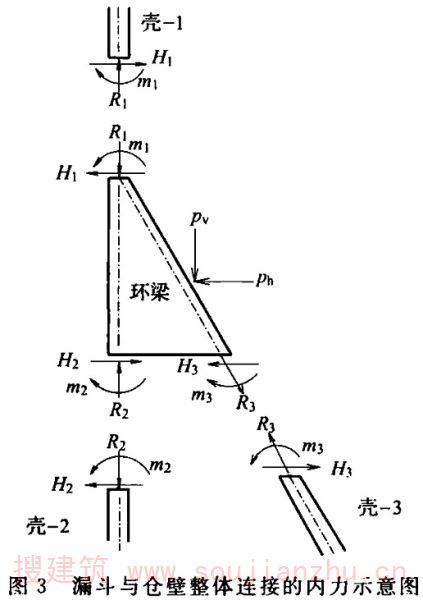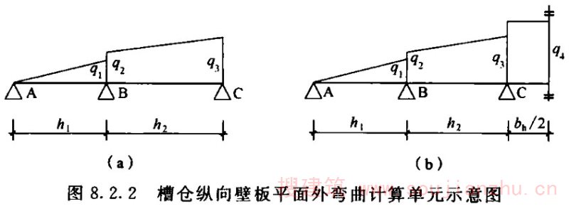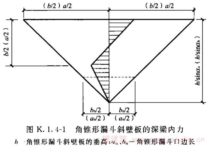 1)角锥形漏斗(斜)壁板的平面内弯曲可简化为符合平截面假定要求的单独三角形深梁计算,其计算高度可釆用1/2跨长;