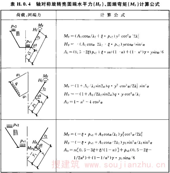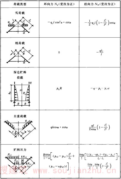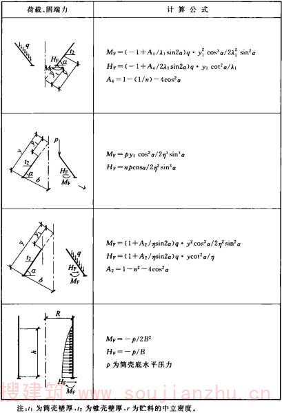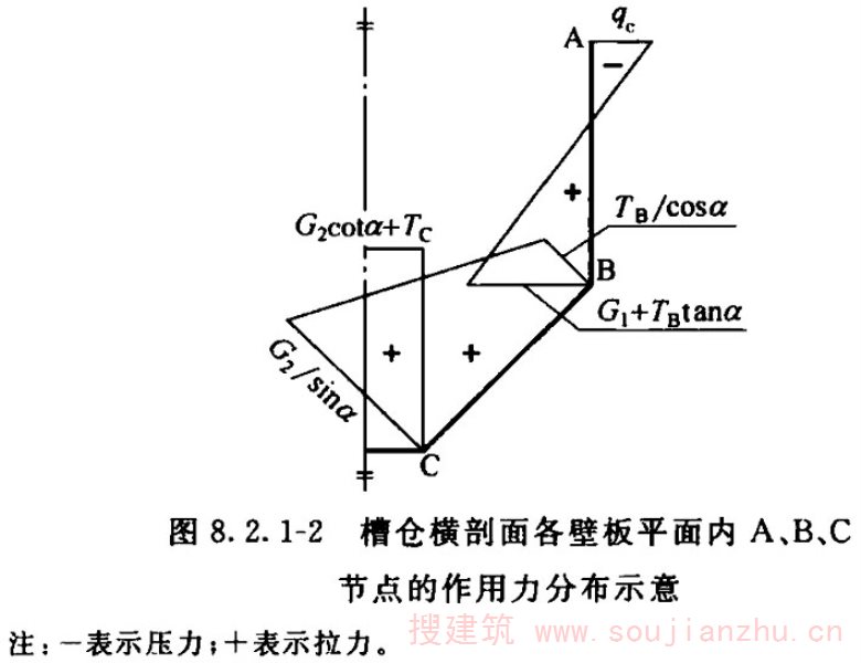 注:漏斗顶部无仓壁仅有边梁的对称、非对称角锥形漏斗相邻壁(斜)板交接边棱的轴向拉力t p ,适用于漏斗四角吊挂骨架筋的截面计算。