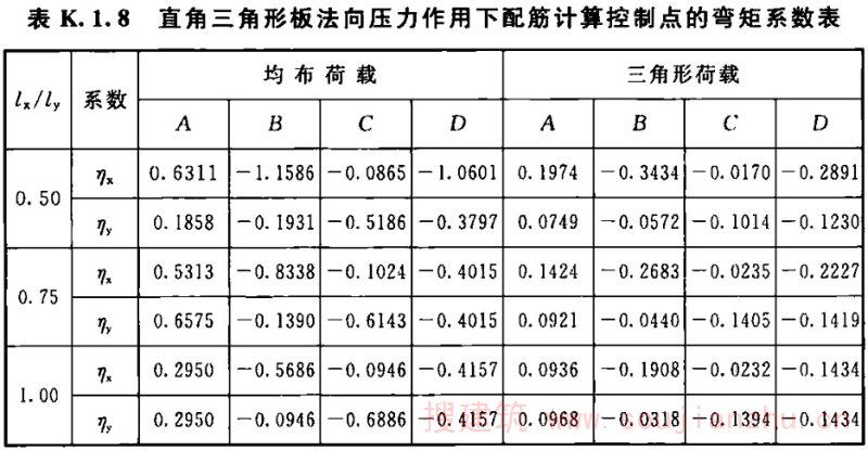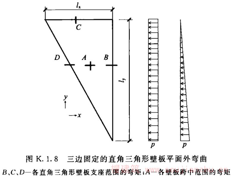 K.1.8 角锥形(楔形)漏斗三边固定的直角三角形壁板平面外的弯曲(图K.1.8)可按下列公式计算,式中系数η x 、η y 可按表K.1.8计算: