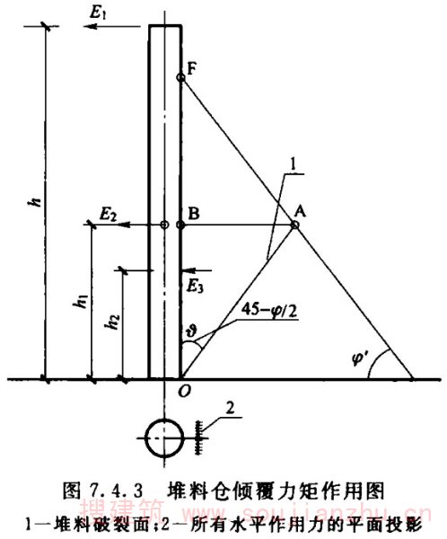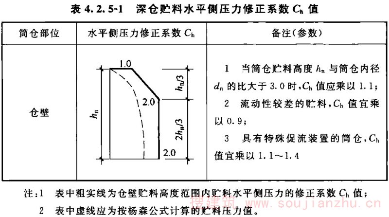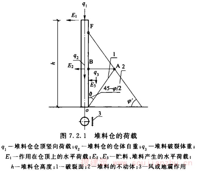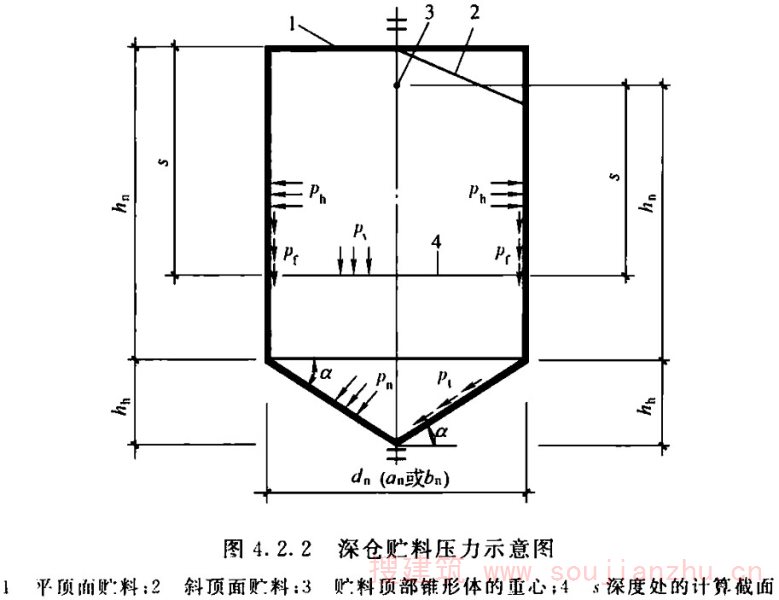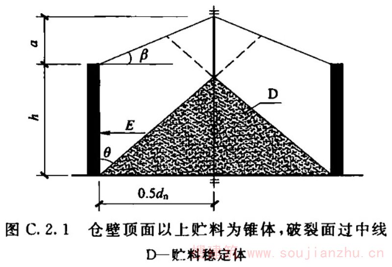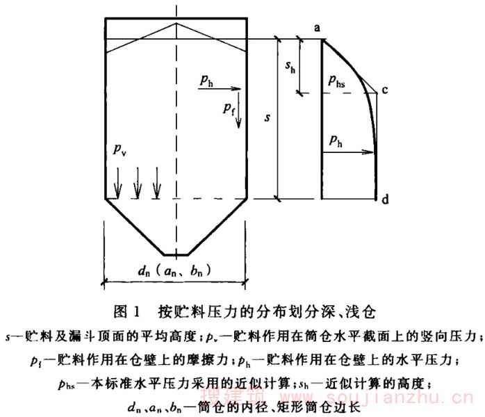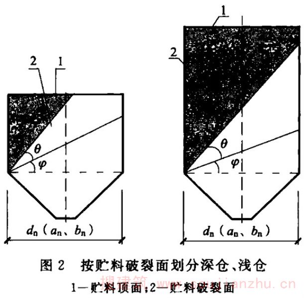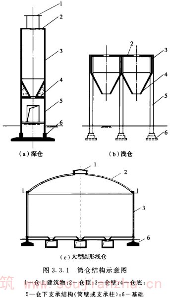 2.1.1 对于筒仓的术语,如hopper、bunker、bin等单词来自英语,silo来自法语。国际标准化组织(ISO)将hopper、bunker、bin统称为silo,即我们所说的筒仓。本标准采纳国际标准化组织的规定,不再使用除silo以外的英文用词。本条中的直立容器,是指由柱或筒壁支承并由直立式仓壁封围的贮存贮料的容器,构成该容器的总体称为筒仓,其与仓体的长、高尺寸及其比值无关。这与中文中筒子的概念有所区别。也就是说,高度不大于横向尺寸的筒体也可以称为筒仓,其平面也不限定为圆形。这样,平面为其他几何形状包括槽仓在内的贮仓也可称为筒仓。但由于平面形状更复杂的筒仓,如六角形、八角形还有其他几何形状的筒仓,在我国较少使用,故本标准编制的内容中只限于平面为圆形或矩形的筒仓。 近年来出现了直径达100m左右的大型储煤及储料场,有人也把它称为筒仓,事实上这种构筑物与本标准所涉及的筒仓完全不同。储煤场及储料场,虽然在外观上可能与大型筒仓或圆形浅仓相似,但最大的区别是储煤及储料场的料堆并不与其周边的围墙接触,也就是说,煤堆或料堆对其围墙没有直接作用力,其围墙不作为仓壁承受贮料压力,只作为围护结构或承受其顶盖传来的荷载。但筒仓除承受结构自重外,正好与其相反。故不能认为储煤场及储料场就是筒仓,其受力状况、设计、计算及构造原理完全不同,是两种不同结构形式的构筑物。