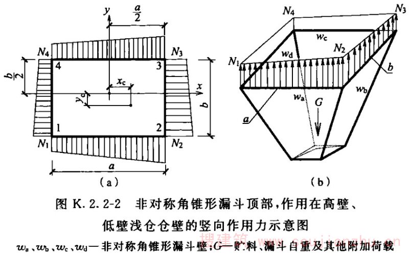 2 非对称角锥形漏斗的高壁、低壁浅仓,仓壁底部的竖向作用力(图K.2.2-2)(kN/m)应按下列公式计算: