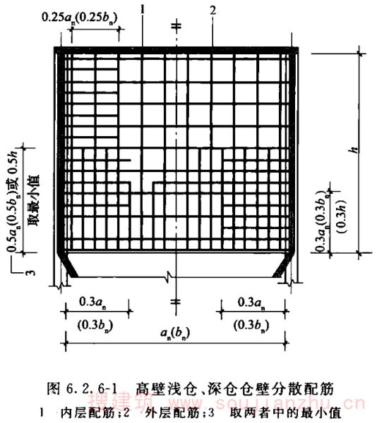 2 高壁浅仓仓壁的平面内弯曲计算可不计与角锥形漏斗壁的共同受力作用,按平面深梁计算。平面深梁的弯曲应力可按分散配筋和集中配筋方式简化计算。