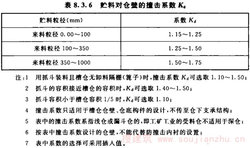 1.0.2 本标准适用于贮存散料的钢筋混凝土及预应力混凝土筒仓,其散料的粒径、颗粒组成、含水量及其他物理力学特性均应符合散体理论的要求。对于平均粒径大于200mm且小于1000mm的粗块状散体,不适用于深仓,只适用于低壁浅仓或斗仓。在冶金工业矿山工程中出现大块散料的概率较大,对仓体的破坏也较严重。其他行业的贮料一般都可控制在200mm粒径或以下,对于粒径更大的块体贮料,其物理力学特性已超出散体力学的涵盖范围,在冶金及矿山工程中,也有釆用矿车直接倒入浅仓或斗仓的装仓方式,在此条件下,其工艺设计应设置破碎、篦子等设备控制物料的粒径。对于体积超大的贮料,既不适用于本标准的深仓,也不适用于浅仓或斗仓。国内使用压缩空气混合粉料调匀仓逐渐减少,但国外设计的筒仓工程仍在使用这种生产工艺,釆用压缩空气装、卸料的筒仓仍可釆用本标准的方法进行设计。槽仓属于平面外形为矩形的筒仓,在我国的工程建设中经常釆用。本次修订仍保留有关槽仓的内容。在修订原规范时,由于受到当时工程实践和技术条件之限,国内建成的最大筒仓仓径为40m,原规范在此基础上制定了筒仓温度应力的有关规定。但近年来直径100m左右及更大直径的筒仓不断出现,原规范中温度应力的有关规定已不能完全适应这类超大型筒仓温度应力的计算。预应力混凝土筒仓及抗震设计的内容将需作适当的调整。本次修订后的抗震要求,除按本标准的规定执行外,尚应符合现行国家标准《构筑物抗震设计规范》GB 50191的有关规定。近年来,预应力混凝土筒仓在我国煤炭、水泥及电力等行业有了很大发展。尤其是对于直径较大的筒仓,使用更为广泛。本次修订除原有的内容外,借鉴国外及近年来国内预应力混凝土筒仓设计及施工经验,增加了有关预应力筒仓设计的内容。近年来,虽然钢纤维混凝土筒仓在国内也有建造,但设计及工程实践经验尚少,青饲料和湿法搅拌贮料的筒仓,其贮料的物理力学特性已不属于散体力学的范畴,本标准将不涉及这方面的内容。对于平面为多边形的筒仓、用壁板连成的群仓、设有内隔板的筒仓及筒中筒的筒仓等,虽然国外有这类筒仓工程,有些部门也反映希望列入这方面的内容,但在我国的工程实践经验尚少,在圆形筒仓中设置隔板,会造成轴对称旋转薄壳结构的内力计算及构造复杂,并增加施工难度,且对料流产生不利影响,贮料及其流动对筒仓的作用力也不明确。故本标准为了筒仓的安全运行,对仓内设置筒中筒、在仓壁上设螺旋溜槽等影响物料流动的设施及由此对仓壁出现的荷载效应提出了必要的限制。对上述几种筒仓设计细则的规定,均不纳入本标准修订的内容。修订后的本标准不仅增加了预应力混凝土筒仓、堆料仓、槽仓的内容,调整了附录的顺序,还根据中华人民共和国住房和城乡建设部的规定,将原规范的名称改为《钢筋混凝土筒仓设计标准》,对原规范中已发现的差错,在本次修订中进行了改正。