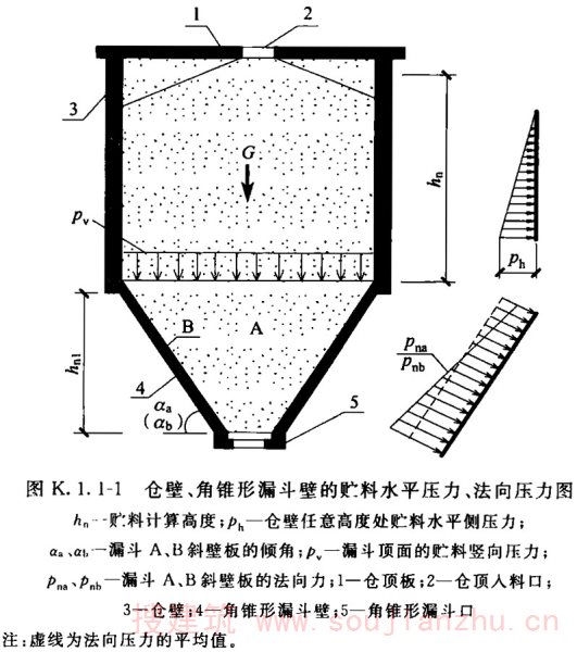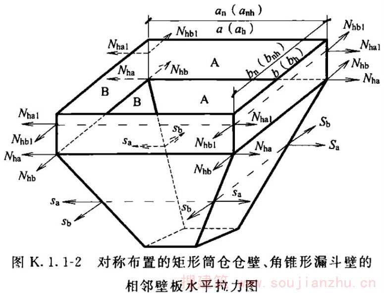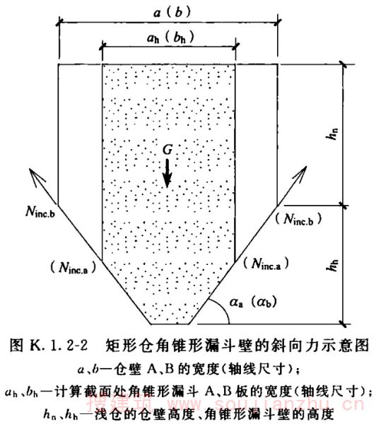 K.1.1~K.1.11 相同条件下的圆形筒仓与矩形筒仓相比,前者具有明显的优越性,因此被近代筒仓工程大量釆用,得到了巨大的发展,但矩形筒仓并未被淘汰,至今在很多工业部门仍然被广泛采用。根据众多工程界人员的反映,原规范有关矩形仓的设计内容偏少,需要充实。为此,本次修订,对矩形筒仓的设计要求,在附录K中做了大量的补充,尤其是对角锥形漏斗壁板的平面内、外弯曲的计算,给出了大量实用的简化方法及便捷的计算公式,从而为设计人员解决了复杂的空间结构计算问题。众所周知,建、构筑物多为空间结构体系,把复杂的空间结构简化为平面结构计算,是工程界普遍釆用的实用方法。一般来说,合理的简化结算结果,通常要比精确计算的结果可靠度更高,但并非排斥釆用实用程序计算。 本附录所釆用的简化计算方法及计算公式,均釆用欧洲筒仓规范Eurocode Actions on Structurers Silos and Tanks、美国结构工程师手册Structural Engineering Handbook(Mc Graw-Hill Book Company)等资料。