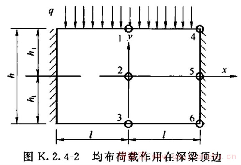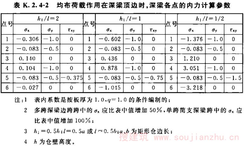2 均布荷载作用在深梁的顶边时(图K.2.4-2),深梁各点的内力计算参数应符合表K.2.4-2的规定。