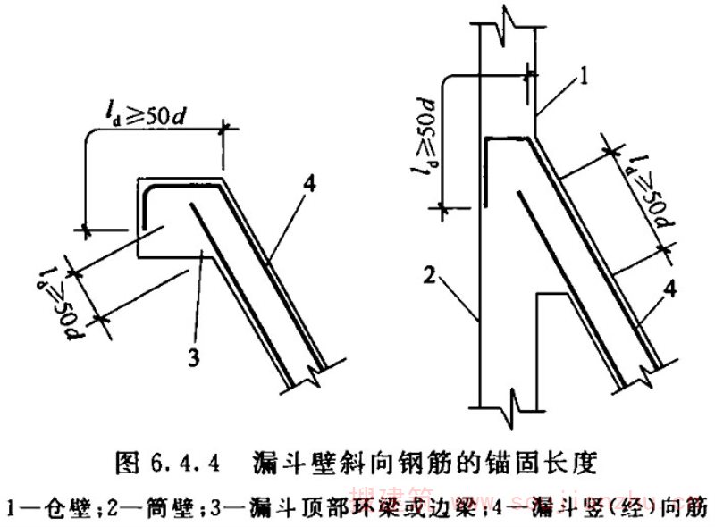 K.2.1~K.2.5 本次修订应各方要求,增加了非对称漏斗卸料口的计算公式。 由于顶部通常不设边梁的漏斗仓,在漏斗四块斜板的交角处,钢筋的锚固长度往往不能满足要求,因此漏斗的整体性将受到严重影响。对于不通过漏斗边梁,而是将漏斗斜板上的吊挂力,依靠漏斗斜板的交边棱,直接吊挂或支承在柱顶上的漏斗仓,其交边棱的吊挂筋(骨架筋)不能完全依靠构造配置,应该通过计算确定。 对于普通浅梁的受剪承载力,是以验算斜截面拉应力为特征的计算。当斜拉应力的向量越来越趋向于水平时,就接近深梁剪应力的分布特征了,这时按浅梁配筋方式配置的竖向箍筋,对约束深梁的竖向裂缝就不起作用了。在我国前后三版的《混凝土结构设计规范》GB 50010中,都有相关的规定:
