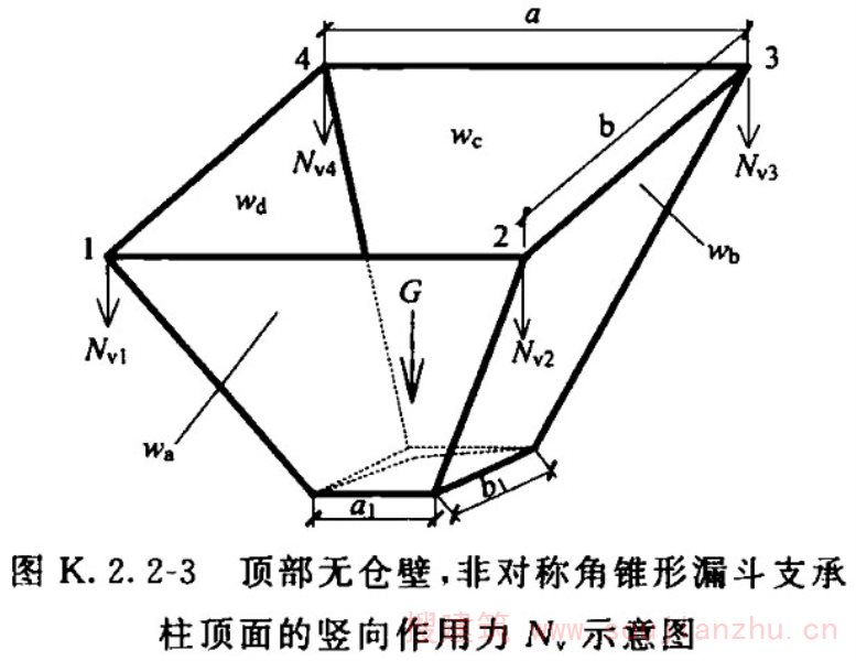 3 顶部无仓壁的非对称角锥形漏斗,在自重、贮料及其他附加荷载作用下,对支承柱顶面的竖向作用力N v (图K.2.2-3)(kN)应按下列公式计算: