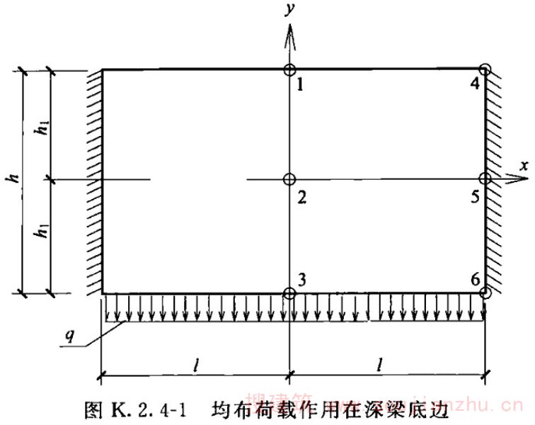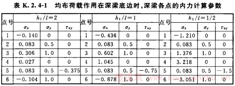 1 均布荷载作用在深梁底边时(图K.2.4-1),深梁各点的内力计算参数应符合表K.2.4-1的规定。