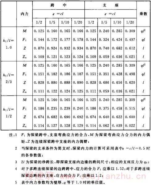 本节中各种荷载作用及支承条件下,平面深梁的内应力是深梁中面的内应力,其计算表是按深梁的单位厚度编制的。也就是说,是按深梁厚度为1.0编制的。采用深梁计算表时,应将表中内应力的数值乘以具体工程深梁的板厚,并以此配置钢筋。