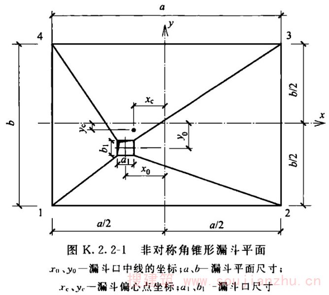 1 非对称角锥形漏斗口的偏心距(图K.2.2-1)应按下列公式计算: