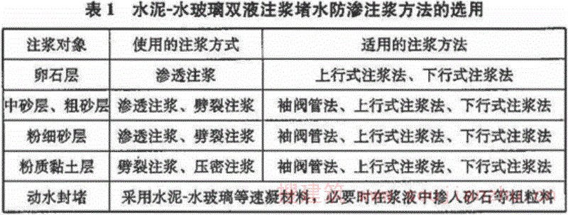 3压密注浆的孔距是根据被注土体的深度及要求达到的密实度等确定,一般的孔距为1.8m~3.0m;劈裂注浆的孔距控制在1.5m~3.0m;渗透注浆孔距宜为1.0m~2.5m,第一序孔距可适当增大。 4注浆压力是注浆过程中的一个重要参数,压力过低,浆液携带的能量小,达不到注浆要求的扩散半径;压力过高将使地表出现冒浆现象,浪费注浆材料。本条根据工程实例对注浆压力进行了规定,实际施工中,注浆压力宜通过现场注浆试验确定,一般情况下,后序注浆孔应适当提高注浆压力。 5一般情况下,水泥浆与水玻璃浆液体积比可为1:0.1~1:1;特殊情况下,应根据具体情况,进行配合比室内试验,地层可注性差时可适当降低水玻璃的掺量。 6在应急处理或特殊条件下及在动水条件下,为防止浆液在动水条件下流失,采用预填砂卵石等粗骨料或其他惰性材料,降低地下水的渗透,然后再用水泥—水玻璃浆液进行注浆,如果工程比较重要时,则要求进行注浆试验确定注浆工艺、施工参数及浆材配合比。水泥—水玻璃双液注浆用于堵水防渗时,应根据注浆工程的目的、水文地质条件、工程重要性等,按表1选择注浆方法。
