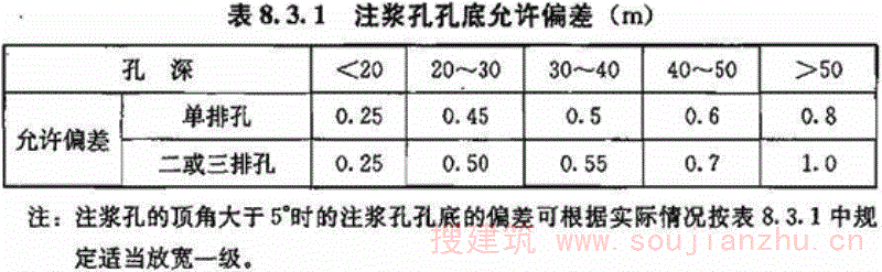 4 垂直孔或顶角小于5°的注浆孔,孔底的允许偏差应符合表8.3.1的规定。钻孔偏差值超过设计规定时,应及时纠偏并采取补救措施。