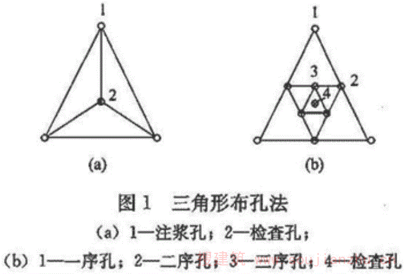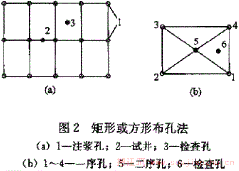 8.2.3注浆设计时,其参数应满足下列要求: 2浆液的扩散半径跟地层的渗透系数有关,一般应根据现场试验确定。现场注浆试验常采用三角形(图1)和矩形或方形布孔法(图2),通过钻孔取芯、压水或注水试验检查和评价浆液的扩散半径。