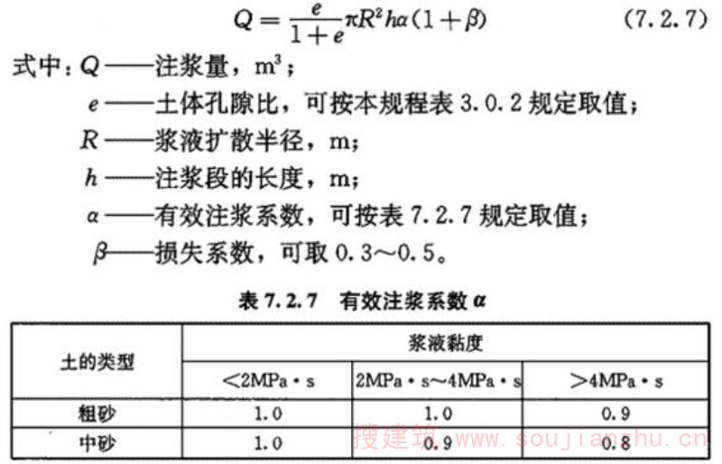 3.0.2注浆浆液配比的选择和注浆效果,与所注地层的特性关联密切。针对双液注浆工程的特点,本条明确规定了岩土勘察应取得土层的孔隙比、土层的渗透系数,为确定地层的可注性、注浆量等提供设计依据。表中数据是总结注浆工程实例和有关资料取得。对于没有取得相关地层参数的情况下,可参考表中数据取值。