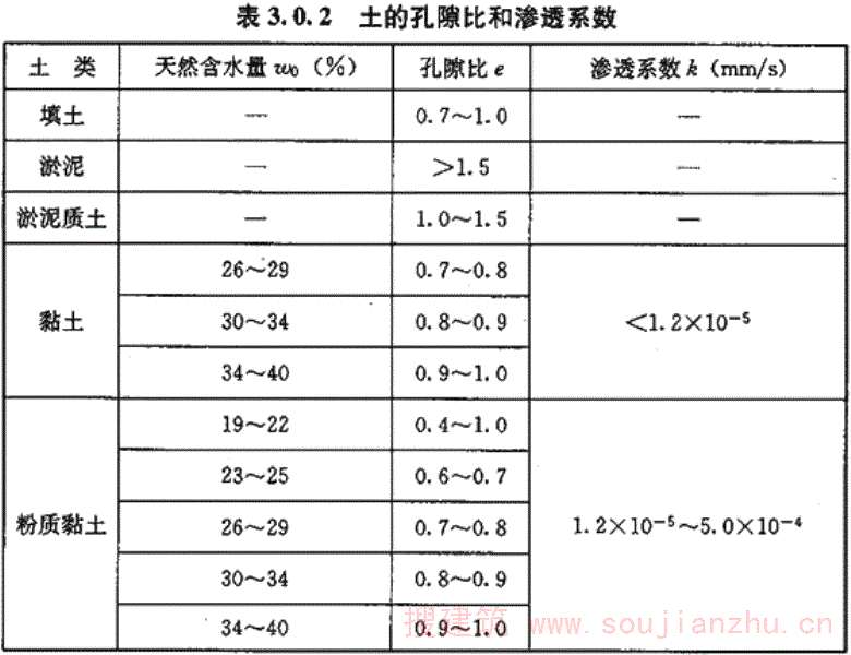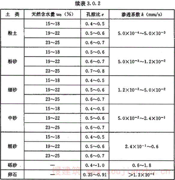 3.0.2 对岩土的分类应符合现行国家标准《岩土工程勘察规范》GB 50021和《土的工程分类标准》GB 50145的规定。采用水泥—水玻璃双液注浆设计和施工时,应取得岩土层的颗粒级配、含水量、密度、孔隙比、渗透性、强度、压缩性、承载力等指标。当无试验或经验指标时,土的孔隙比和渗透系数可按表3.0.2取值。
