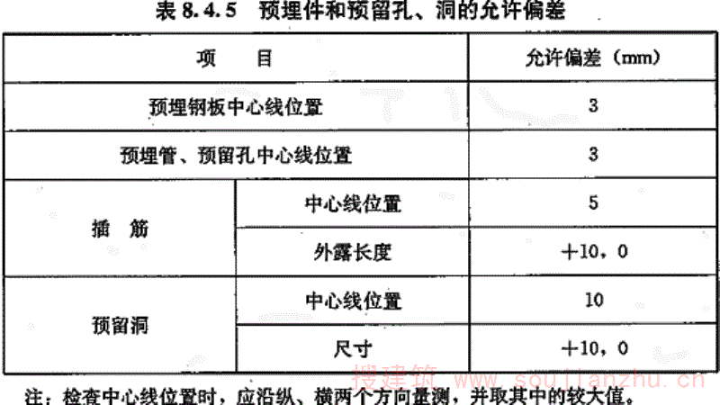 8.4.5 固定在模板上的预埋件、预留孔和预留洞均不得遗漏,且应安装牢固,其允许偏差应符合表8.4.5的规定。