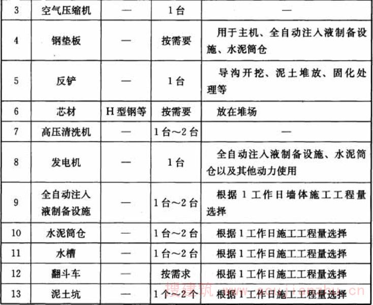 5.5.10~5.5.13一般情况下,在施工完成的墙段端部拔出链状刀具。当需要插入型钢时,为了不影响转角型钢的插入,在场地条件允许的前提下,宜在墙体端部以外继续切割搅拌土体,形成避让段,避让长度不宜小于3m。 链状刀具拔出作业时,应在墙体施工完成后立即与主机分离。根据链状刀具的长度、起重机的起吊能力以及作业半径,定链状刀具的分段数量。 链状刀具拔出过程中应防止混合泥浆液面下降,为此,应注入一定量的固化液,固化液填充速度应与链状刀具拔出速度相匹配。拔出速度过快时,固化液填充未及时跟进,混合泥浆液面将大幅下降,导致沟壁上部崩塌,机械下沉无法作业;同时链状刀具底端处形成真空,影响墙体质量。反之,固化液填充速度过快,注入量过多会造成固化液的满溢,产生不必要的浪费。 一般,链状刀具拔出时的固化液注入量为:
