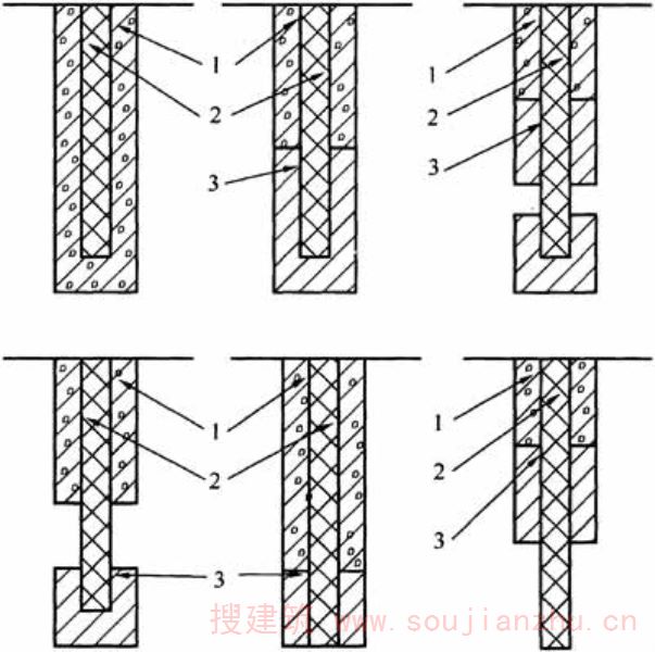 2.1.1在岩土工程的实际应用中,单一桩型有一定的局限性:砂石桩等散体材料桩对软弱地基处理后承载力提高幅度不大;水泥土类桩的桩身强度受土质、施工工艺影响较大;在软土中采用振动沉管灌注桩施工时,由于振动和挤土效应易造成缩径和断桩现象;预应力管桩在软土中单桩承载力较低,且需进入密实土层,桩身材料得不到充分发挥。20世纪90年代初至今,全国各地逐步发展了刚性桩、柔性桩、散体桩相互复合的桩型,并用于实际工程。 劲性复合桩是将常用的散体材料桩、柔性水泥土类桩、刚性混凝土类桩三种单一桩型相互复合,后一种桩体在前一种桩体上进行再次施工,形成互补增强的劲性复合桩型。可分为散体桩与柔性桩复合成的散柔复合桩、散体桩与刚性桩复合成的散刚复合桩、柔性桩与刚性桩复合成的柔刚复合桩,以及散柔复合桩和刚性桩复合成的三元复合桩。其中在散体桩、柔性桩或散柔复合桩桩体上再进行刚性桩施工后形成的桩又称为劲芯复合桩。劲芯复合桩由内芯和外芯两部分组成,根据内芯的长度又可分为长芯、等芯和短芯等。