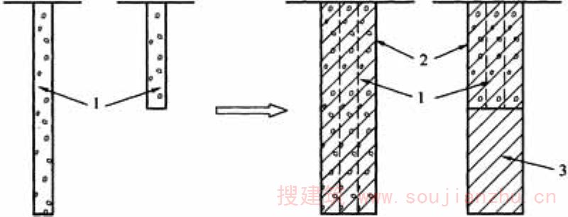 散体桩、柔性桩、刚性桩经复合施工形成的具有互补增强作用的桩。