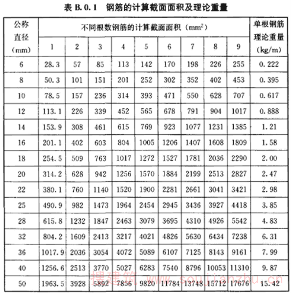 B.0.1~B.0.3 本节给出了常用钢筋的公称直径、公称截面面积、计算截面面积及理论重量,供工程中使用。其他钢筋的相关参数可按产品标准中的规定取值。